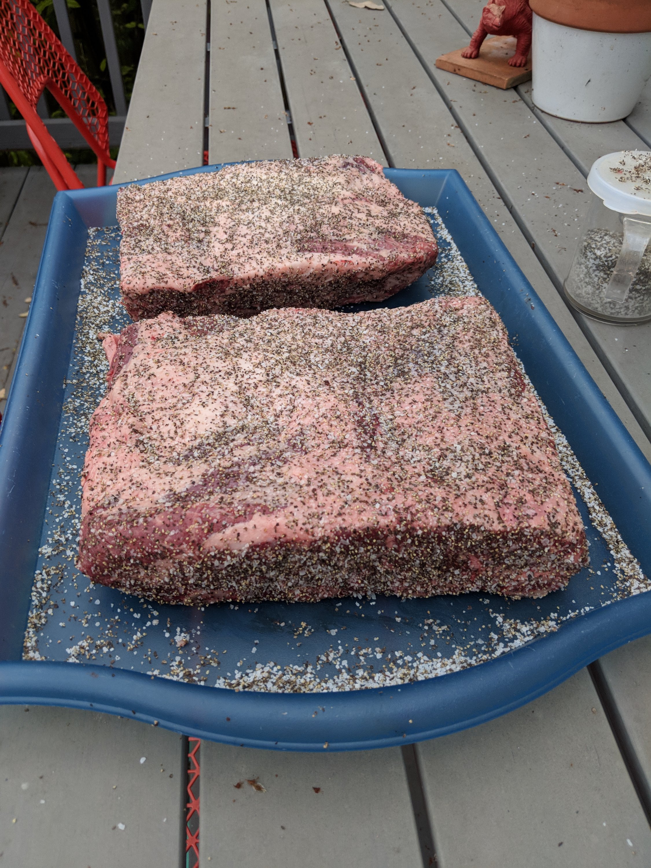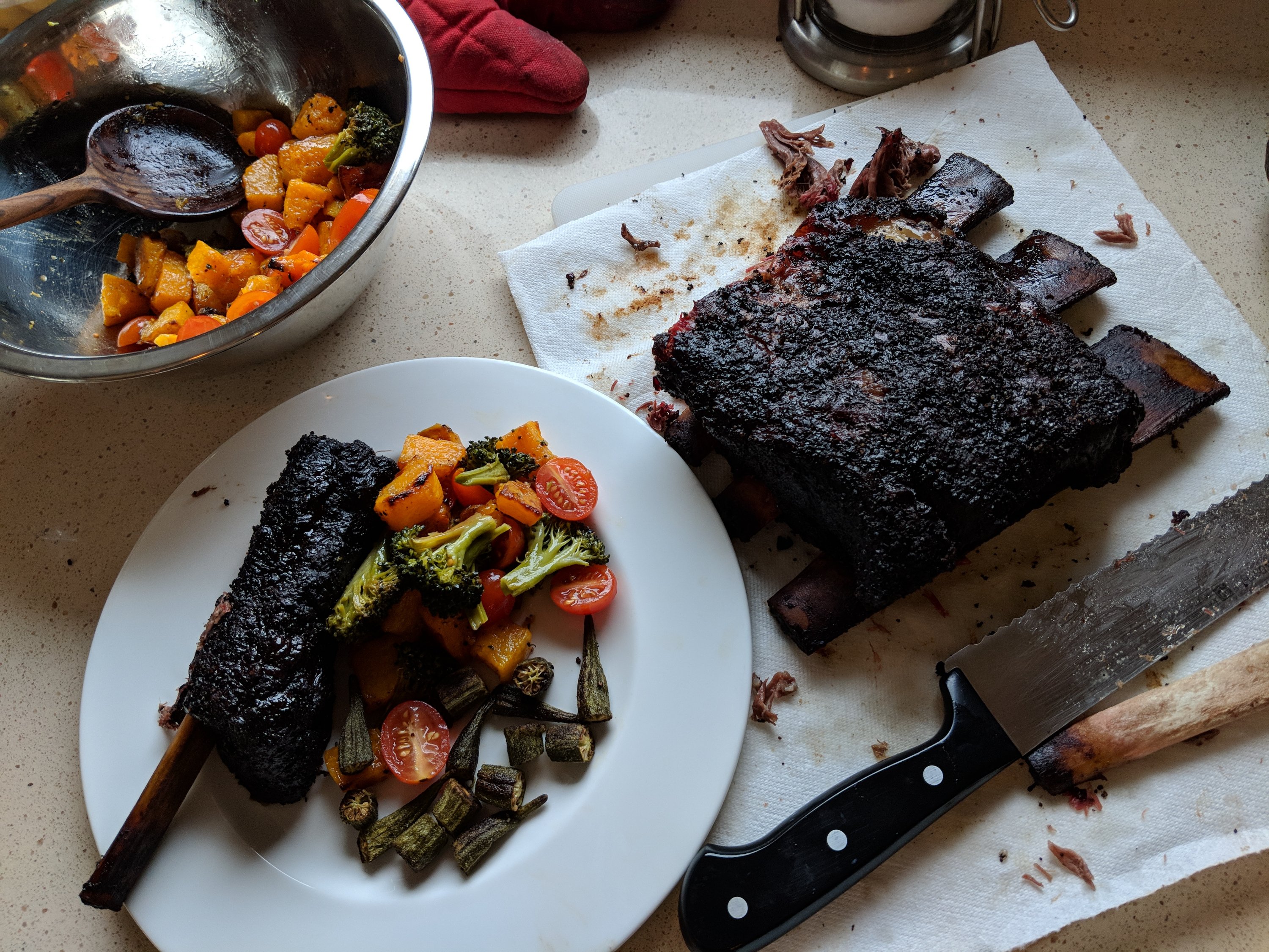 beef ribs March 12, 2018 Ten years plus deep into BBQ experimentation, I finally tried beef ribs. Easy cut, lots of fat, came out great.